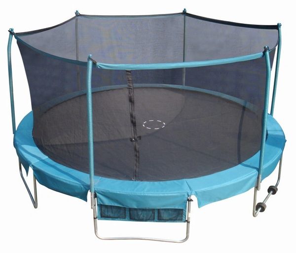 This trampoline features 330 lb weight capacity with an ultra durable uv resistant tencate permatron trampoline park quality jump mat built on a super heavy duty 3 inch dia thick walled double galvanized and powder coated steel frame. With a diameter of 15 feet and a maximum load capaci. Round trampoline and enclosure combo with shoe bag and roll away wheels bring even more family fun to your yard with the trainor sports 15 ft.