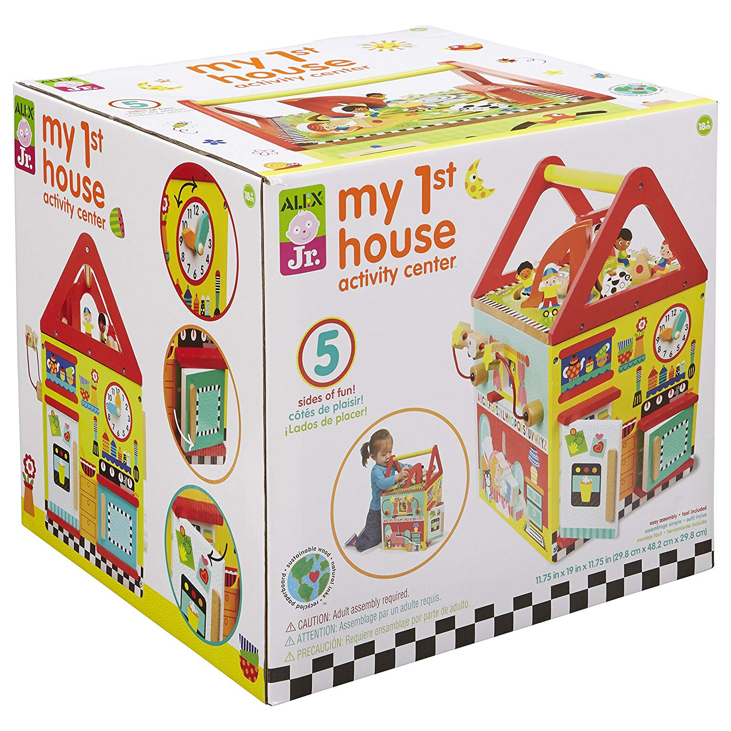 Alex junior my first house activity center let s play house each side of this wooden cube house is a different room with a kitchen bedroom bathroom family room and backyard the house includes a mirror peek a boo doors wagging tails. Please call your local store to check in store availability before heading there. Of activities on the top that gives you 4 rooms and a backyard each with exciting things to do.