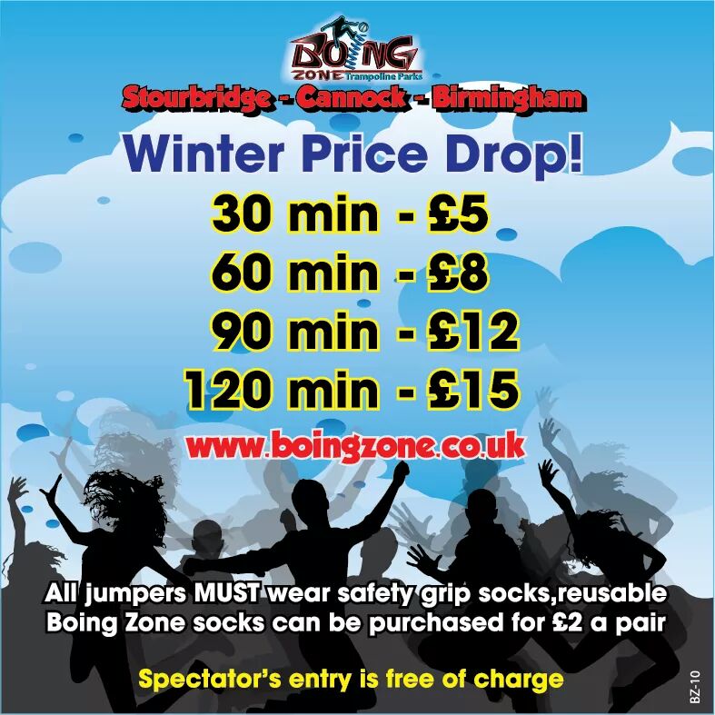 Your own custom music and full access to all party rooms. Re usable safety jump socks must be worn and can be purchased for 2 50. Boing zone trampoline park cannock.