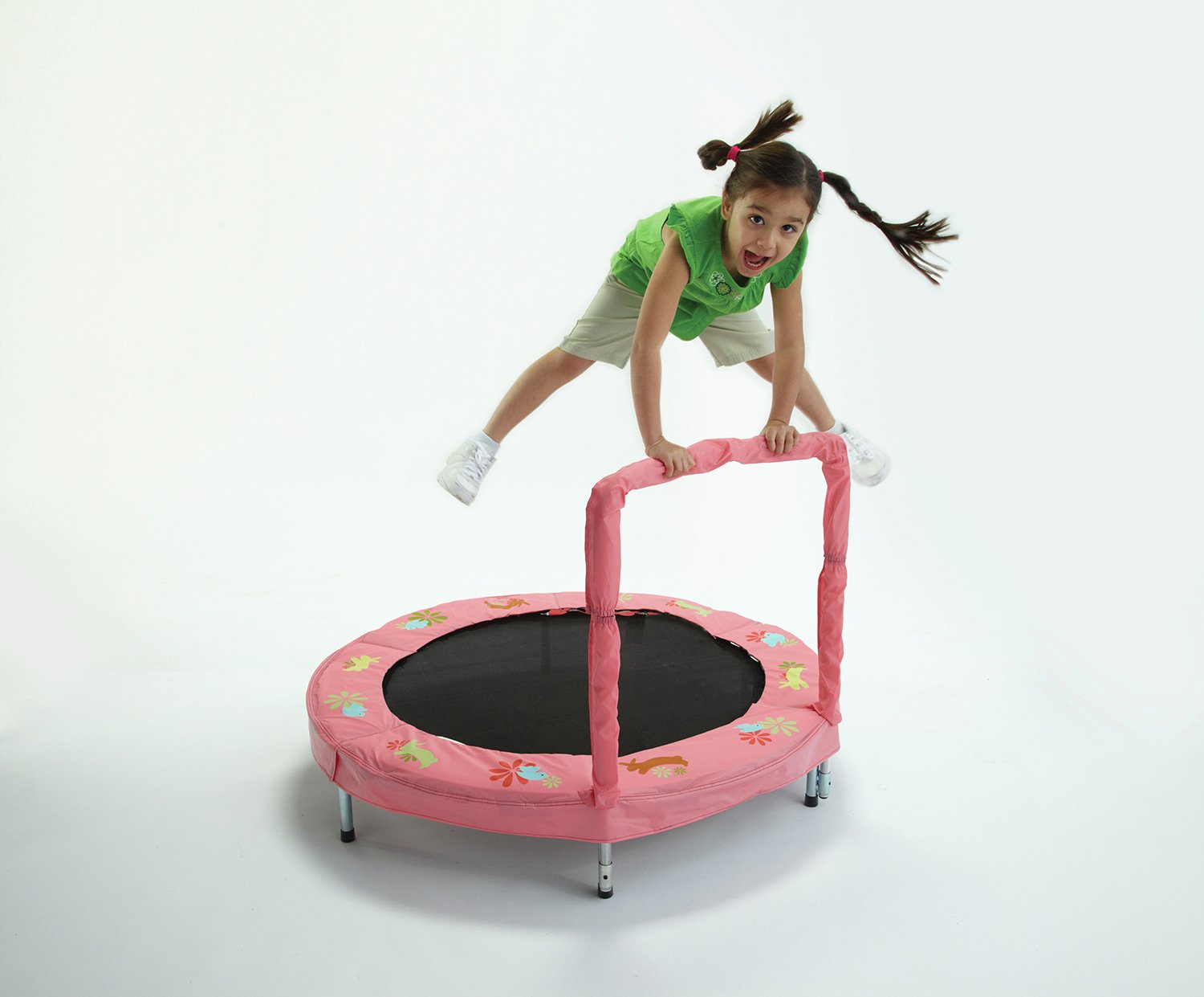 Ancheer trampoline for two kids max load 100kg includes handle 5 height settings stainless steel springs folding trampoline for children toddler indoor outdoor exercise 143cm x 91cm x 17cm 4 5 out of 5 stars 38. The handle also adjusts to 2 different heights so the bouncer is perfect for all different sizes up to 100 pounds. Jumpking s trampoline line offers a variety of shapes and sizes including a variety of rebounders perfect for anyone looking for a trampoline that s a bit unique.