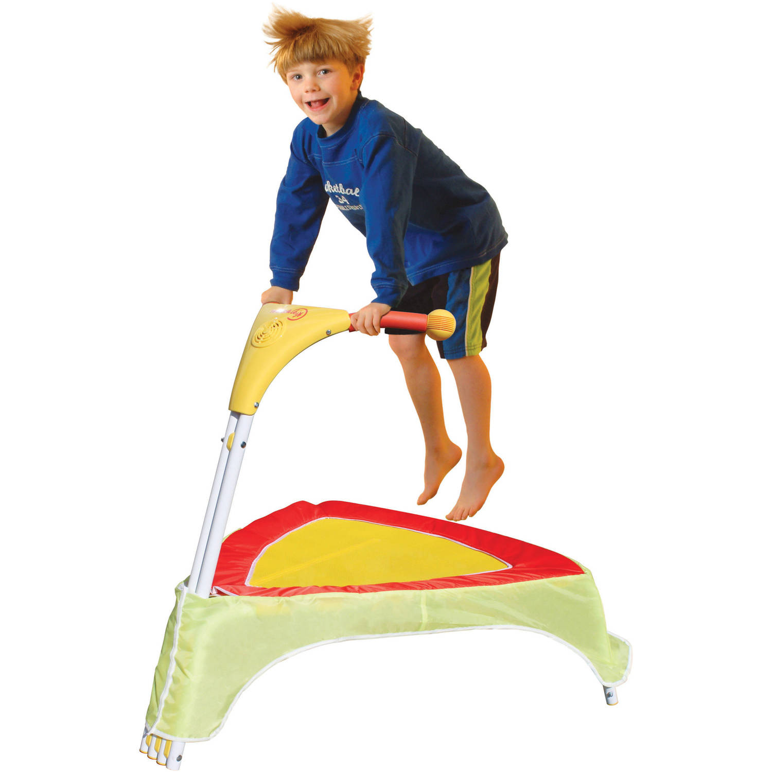 This mini trampoline with a safety grip handle is perfect for keeping kids active indoors. Bounce counting musical statues silly sounds animal sounds and memory match. Use indoors or outdoors.