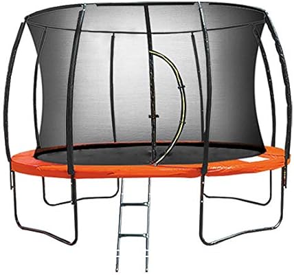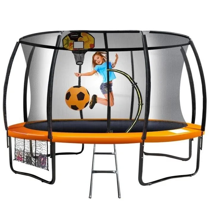 It is constructed from a heavy duty steel frame and tear resistant padding. It features padded springs and a safety net to reduce the risk of injuries. Kahuna trampoline 10 ft safety pad mat net orange.