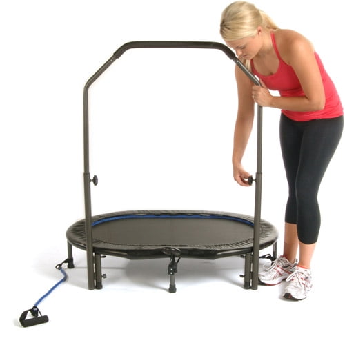 Oval jogger mini trampoline. Some mini trampolines including the stamina intone oval jogger come with resistance bands that let you tone your arms as you jump. The stamina in tone oval jogger comes in an oval shape versus the traditional circle shaped trampolines to give you more stability and the opportunity to add more variety to the workout. Unlike the stamina model above this one comes with a handlebar setup that lets you hold on to something while jogging or rebounding.