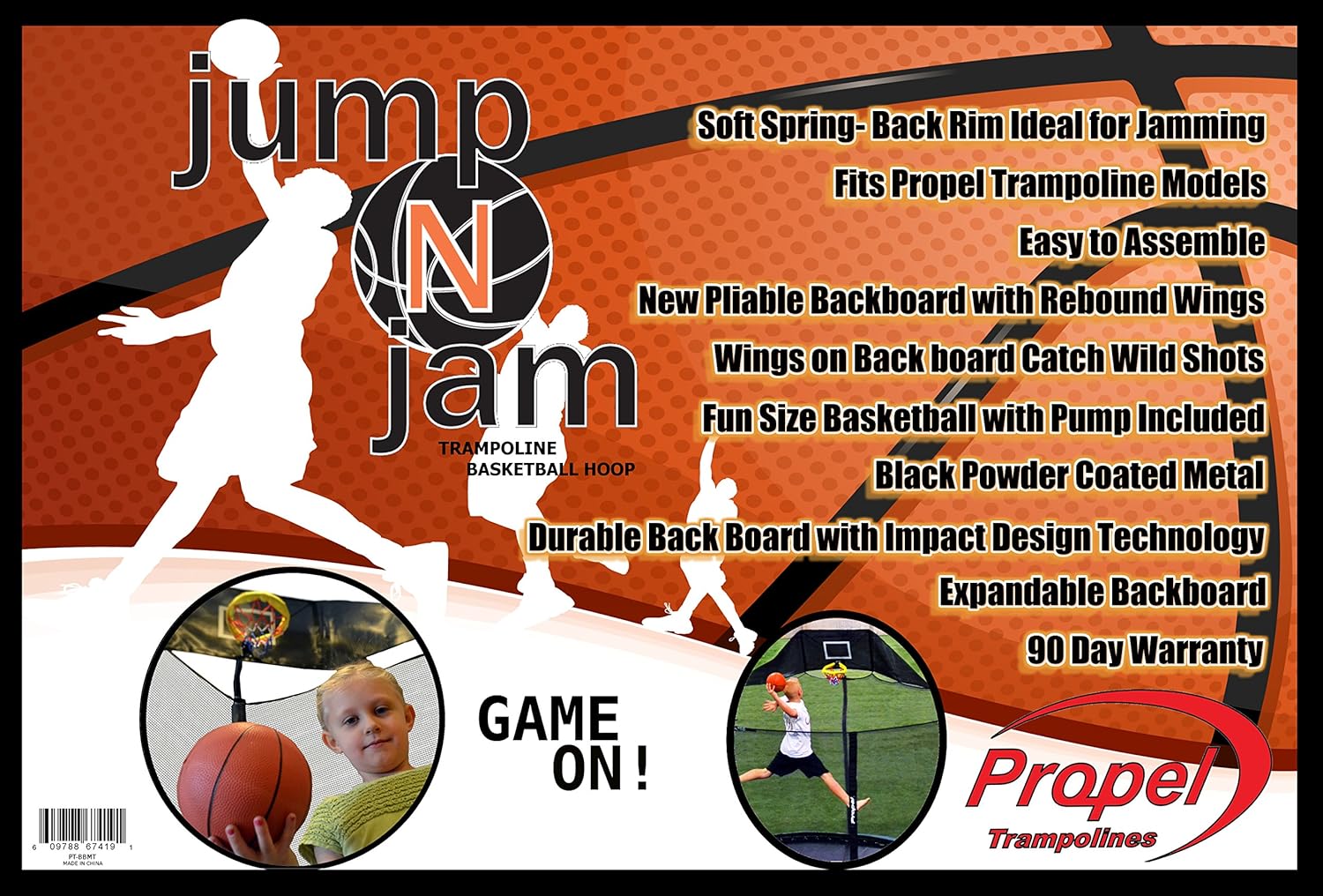 Propel trampoline jump n jam basketball hoop. The propel trampoline jump n jam basketball hoop features. Designed to fit propel trampolines this basketball hoop has a 10 safety flex rim and sturdy backboard. Perfect your dunk with the propel trampolines jump n jam trampoline basketball hoop.