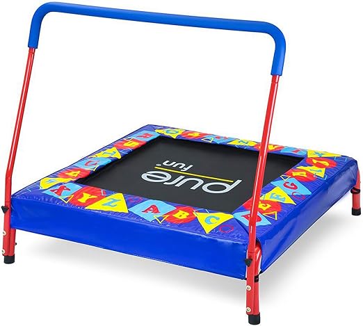 Pure fun preschool jumper kids trampoline with handrail the pure fun preschool jumper kids trampoline with handrail is ideal for playing and learning. It s bouncy enough for children and a bit better than elastic band based mini trampolines in the same price range as the springs will last longer. The abc padded cover makes it fun to bounce while encouraging a child s alphabet color and shape recognition.