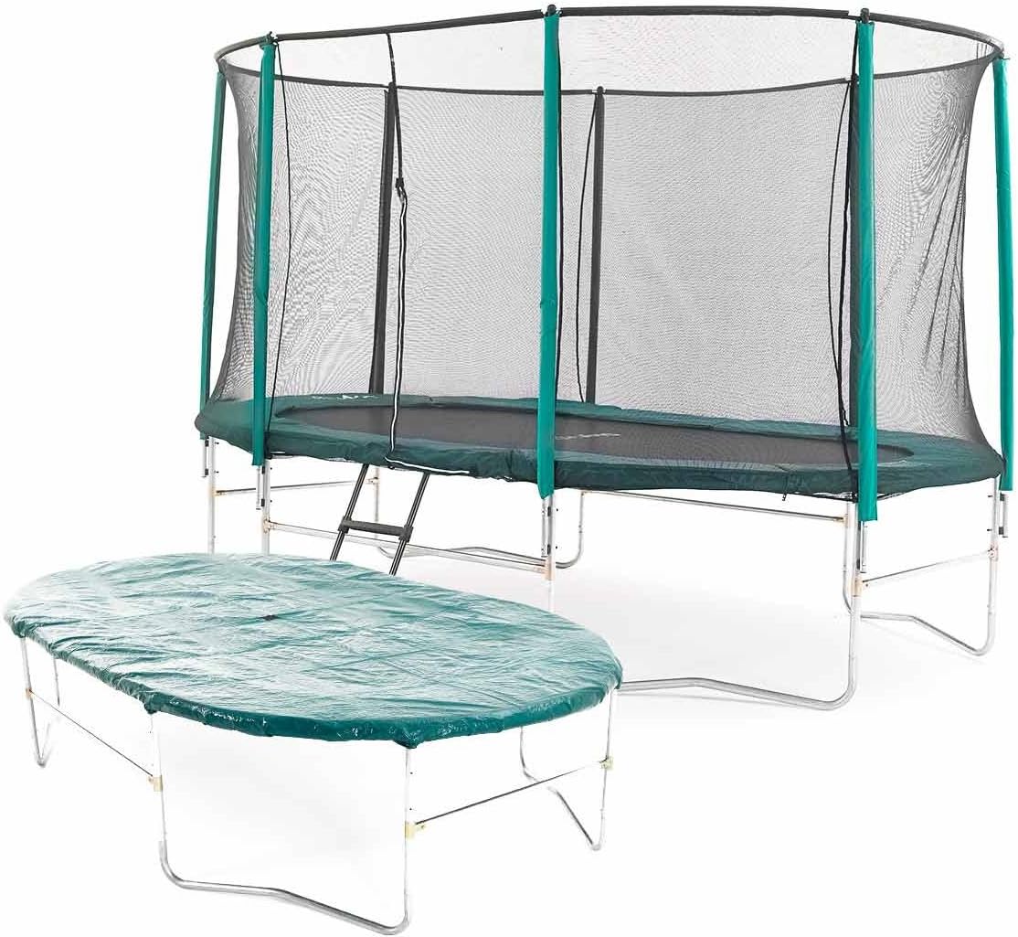 The first trampoline i d recommend is the 8 foot x 14 foot skyhigh oval trampoline with a ladder and cover view the price. We had their 8x14ft oval version on test. It does not pull users to the center like the typical round trampolines.