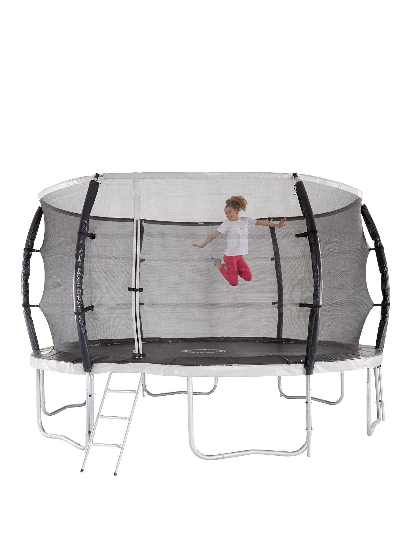 Suitable for use with sportspower trampolines from 8ft to 14ft. 14ft steelflex pro enclosure trampoline with fly slama jama basketball hoop. Includes adjustable easi store weather cover.