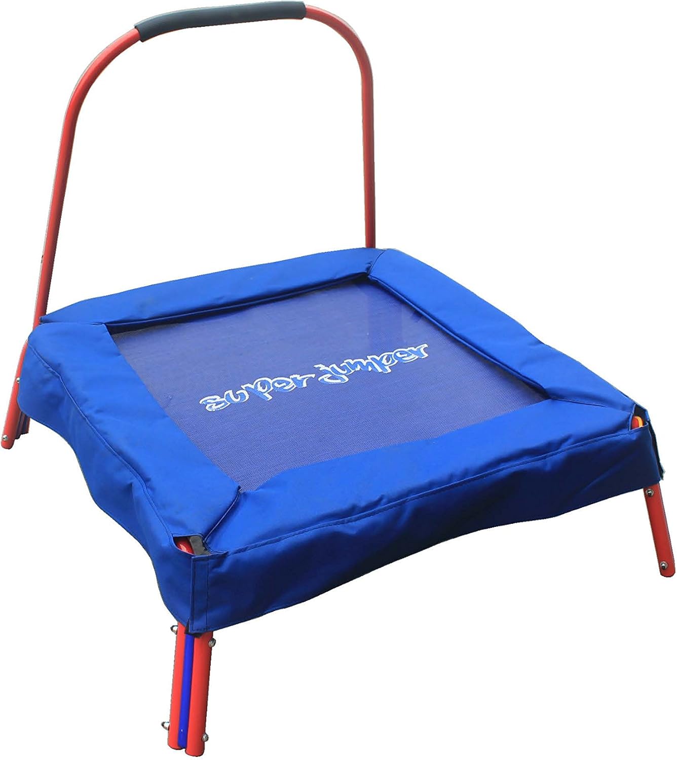 The super jumper junior trampoline features an easy grip padded handle for extra stability and sturdy no spring construction for safer bouncing. The pad covers the springs and trampoline frame and helps to protect the jumper from getting pinched by the springs falling between the springs or impacting the frame it s blue in color and are designed to go around the outside edge of the trampoline covering the springs that holds the trampoline frame and trampoline mat together. How does amazon calculate star ratings.