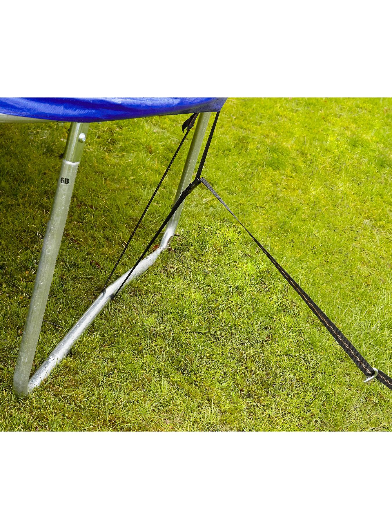 Attach this anchor kit. Set includes 4 straps and 4 spikes to allow secure trampoline frame to ground at 4 anchor points. The metis trampoline anchor kits are ideal for ensuring your trampoline is secured to the ground to reduce the risk of it blowing over in strong winds adverse weather.