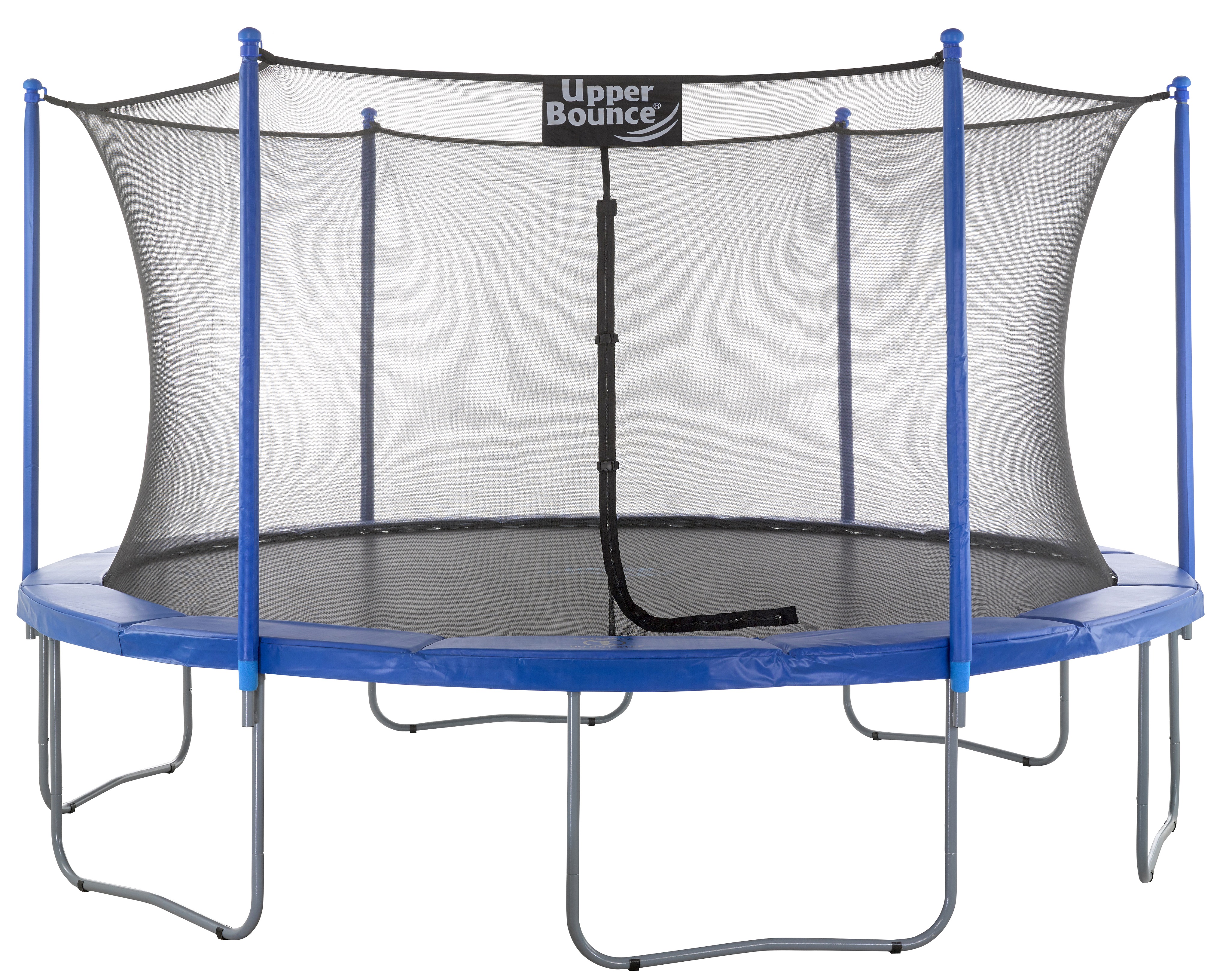 For 15 foot wide trampoline frames poles not included trampoline net only an safety enclosure system using straight steel poles with blue pole caps that hold the net using bolts total of six 6 safety enclosure straight poles the bottom of the trampoline net attaches to your trampoline mat s v rings using the included ropes. Recommended for kids and adults aged 7 years and up. 12ft round trampoline safety net enclosure pad rain cover ladder outdoor 439.