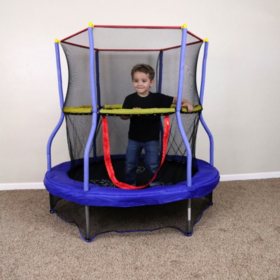 Skywalker sports skywalker trampolines 55 round bounce n learn interactive trampoline mini bouncer with enclosure and sound. It features a sturdy frame and interlocking handlebars for added stability and safety with a simplified assembly process. This bouncy kids trampoline will help your little ones develop gross motor skills while promoting imaginative play.